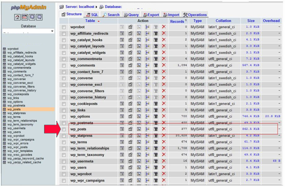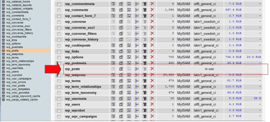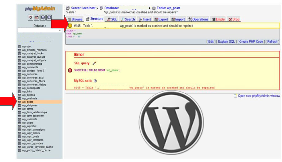4. Kemudian Klik dpada tabel “wp_posts“. Muncul Pesan kesalahan ‘… / Wp_posts’ is marked as crashed and should be repaired. Ini yang perlu kita perbaiki.