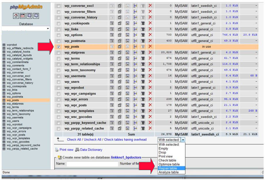 5. Checklist/centang pada tabel “wp-post“, lalu pada drop down menu pilih “Repair Table“.