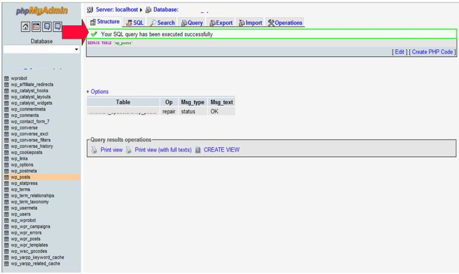 6. Maka akan muncul pesan : “Your SQL Query has been executed successfully“. Berarti tabel telah selesai dan sukses direpair.