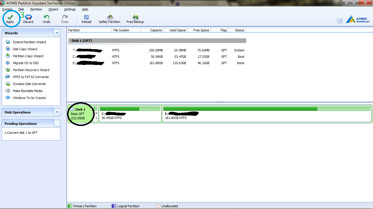 - Kemudian perhatikan hardisk anda, sudah berubah dari MBR ke GPT, Lalu tinggal anda KLIK APPLY seperti nomor 3 pada gambar berikut ini :
