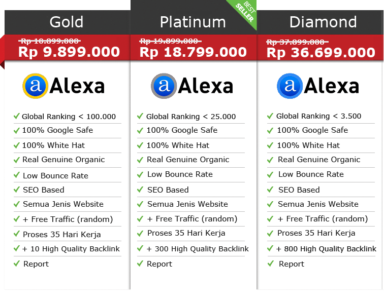 Begitu pentingnya alexa rank untuk suatu website, namun sayangnya tidak semua pemilik Website mampu menurunkan Alexa rank dengan cepat, aman, terbaik, terpercaya sesuai dengan algoritma mesin pencarian yang dikehendaki Alexa.com, karena menurunkan alexa rank membutuhkan beberapa teknikal skill yang tidak mudah. Namun anda tidak perlu khawatir, kabar gembiranya adalah kami memberikan solusi untuk anda yang masih kesulitan untuk menurunkan alexa rank, tentu dengan biaya yang sesuai dengan kebutuhan anda.