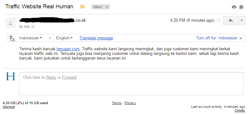 Berikut ini adalah beberapa contoh Testimoni Clients kami yang telah mempercayakan Jasa Traffic Website kepada herugan.com… Client Kami Mulai dari PERSONAL hingga PERUSAHAAN, Level Menengah Hingga Level Expert Bisnis.. Kami harap anda adalah selanjutnya..