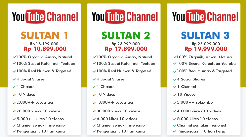 Tingkatkan Subscriber, Views & Likes Channel Youtube sebanyak yang anda inginkan, dengan aman sesuai ketentuan youtube dan dengan real human asli manusia bukan bot atau scam. Silahkan pilih paket sesuai kebutuhan anda di bawah ini.