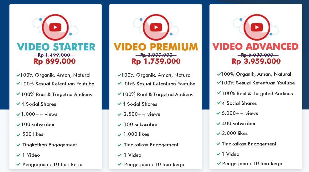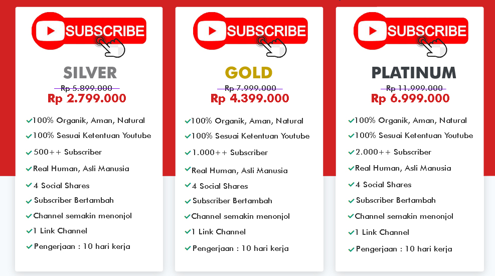 Jika ingin video dan channel YouTube Anda berkembang dengan aman dan sesuai aturan YouTube, segera pesan paket kami di bawah ini. Silahkan hubungi kami sekarang melalui live chat kami. Jika Anda hanya mencari tempat untuk meningkatkan subscriber, views, likes, dan jam tayang di channel YouTube tanpa memperhatikan aturan dan algoritma YouTube yang dapat merugikan video/channel YouTube Anda, menggunakan teknik black hat SEO dengan hasil scam, bot, fiktif, serta menawarkan harga murah, mungkin Anda bisa melewatkan informasi yang baik ini.