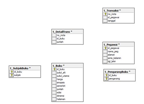 Dalam pembuatan relasi antar dua tabel, yang perlu Anda perhatikan adalah nama field (kolom) yang direlasikan harus sesuai. Pada Gambar diatas pastikan Anda mengecek terlebih dahulu bagian yang dikotaki merah, pastikan nama tabel sesuai dan nama kolom yang direlasikan juga sesuai. Jika Anda sudah memastikannya, Anda klik OK. Dan Anda akan melihat tampilan seperti pada Gambar. Lakukan langkah tersebut untuk tabel-tabel lainnya sampai semua tabel terelasi dan Anda akan melihat tampilan pada Gambar