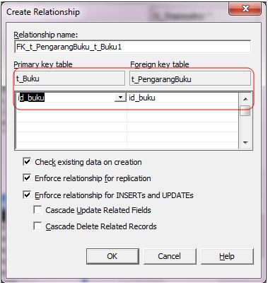 Untuk merelasikan sebuah tabel dengan yang lainnya, misalnya tabel t_Buku dengan t_PengarangBuku, maka klik field id_buku dari tabel t_Buku kemudian drag ke field id_buku tabel t_PengarangBuku dan Anda akan menjumpai tampilan seperti Gambar