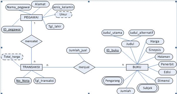 Untuk menyimpan tabel klik icon Save di pojok kiri atas (gambar disket-saya rasa ini pasti tahu), lalu masukkan nama tabel misalnya buku. Lanjutkan membuat tabel-tabel lainnya untuk ERD di bawah ini dengan cara yang sama.