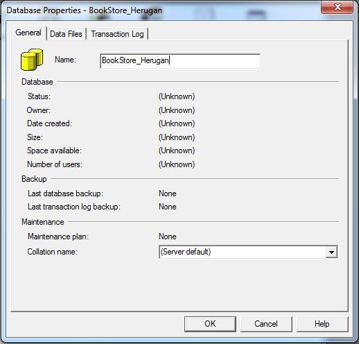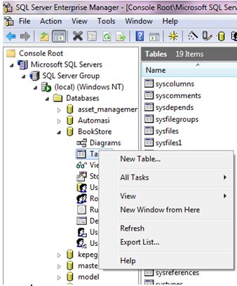 Sebelum membuat tabel, Anda harus mengenal terlebih dahulu tipe-tipe data yang terdapat pada Microsoft SQL Server. Asumsikan nama database Anda adalah BookStore_Herugan / BookStore. Untuk membuat tabel di dalam database Anda, ikuti langkah-langkah berikut :