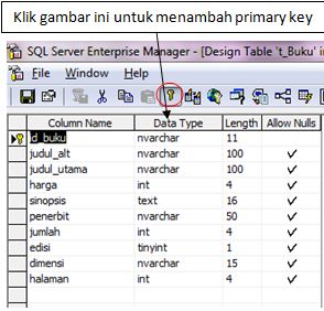 Untuk menambahkan primary key pada tabel buku, maka Anda klik nama kolom yang dijadikan primary key, lalu klik tanda kunci.