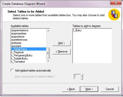 Lalu Anda akan melihat tampilan pada Gambar. Anda klik Next , lalu pilih tabel-tabel yang akan Anda masukkan dengan mengklik nama tabel lalu Anda klik tombol Add. Setelah itu klik Next lagi, lalu Finish.