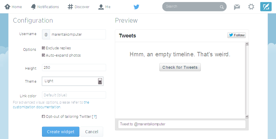 4. Langkah selanjutnya setting/konfigurasi. Untuk Username pastikan username akun twitter anda, untuk height sesuaikan dengan posisi penempatan pada website anda, sedangkan theme sesuaikan dengan selera anda. Lalu klik Button “create widget”.