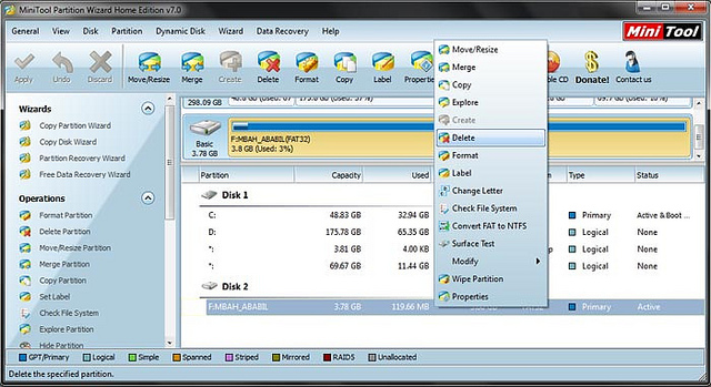 3. Bisa dilihat dari gambar tersebut terdapat partisi harddisk yang ada di komputer rekan-rekan dan memory card yang belum dipartisi. Hapus terlebih dahulu memory card tersebut hingga menjadi unlocatted. Perhatikan gambar berikut :