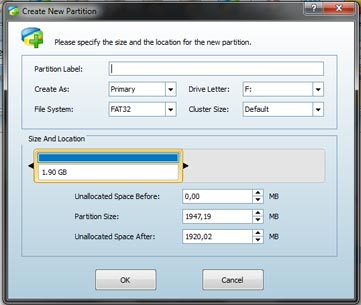 5. Atur ukuran/size partisi yang akan kita bagi, File System’dipilih FAT32 dengan tipe Primary. Seperti gambar berikut :