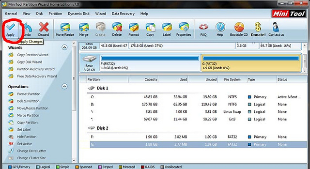 7. Setelah semua dipartisi, jangan lupa untuk meng’klik tombol Apply yang terdapat di bagian sebelah kiri atas. Lihat lingkaran merah berikut :