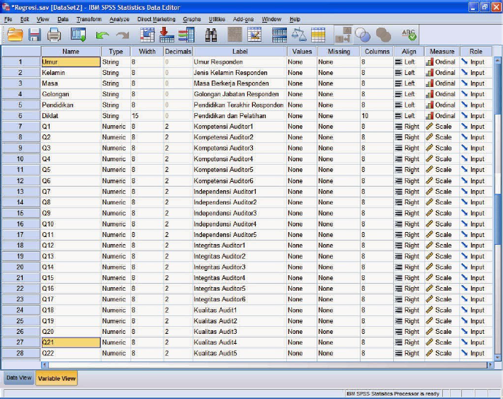 Sedangkan baris ke tujuh sampai dua puluh delapan diperuntukkan untuk menampung data jawaban responden yang disimbolkan dengan Q (Question) yang terdiri atas 22 butir pernyataan untuk 4 Variabel dengan type numeric dan pengukurannya dengan skala (scale). Dalam data yang digunakan Q1 – Q6 untuk variabel Kompentensi Auditor (X1), Q7 – Q11 untuk Variabel Independensi Auditor (X2), Q12 – Q17 untuk Variabel Integritas Auditor (X3) dan Q18 Q22 untuk Variabel Kualitas Audit (Y) (semua angka dan hurus harus diketik sendiri)