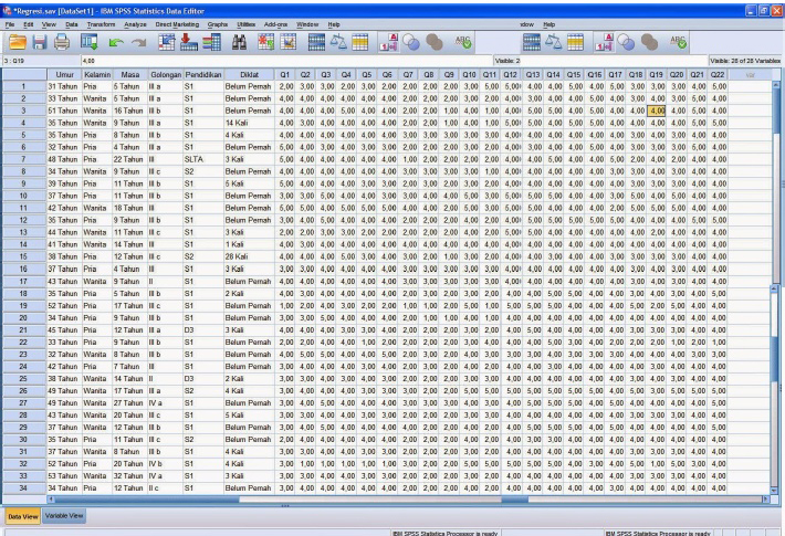 Dari gambar diatas terlihat bahwa responden pertama berumur 31 tahun berjenis kelamin pria, telah berkerja selama 5 tahun, berpendidikan Sarjana (S1) dan belum pernah mengikuti diklat. Jawaban responden ini untuk pernyataan pertama adalah tidak setuju yang disimbolkan dengan angka 2, dan begitulah seterusnya sampai responden 34 silahkan baca sendiri. (semua angka dan huruf diketik sendiri).