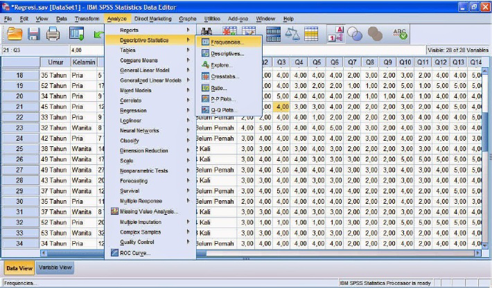 Setelah input data selesai maka selanjutnya sudah dapat dilakukan analisa terhadap data tersebut, maka langkah senjutnya adalah memetakan responden, tujuannya agar diperoleh gambaran mengenai karakteristik responden. Langkahnya Klik Menu Utama Analize, Pilih Descriptive Statistics lalu Frecuencies sperti Gambar di bawah ini :