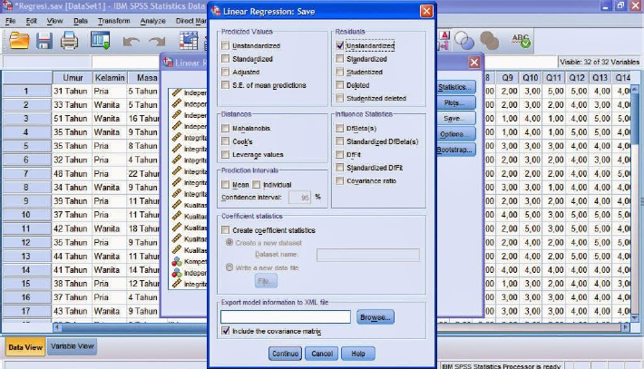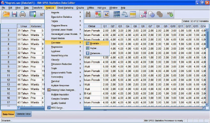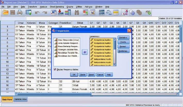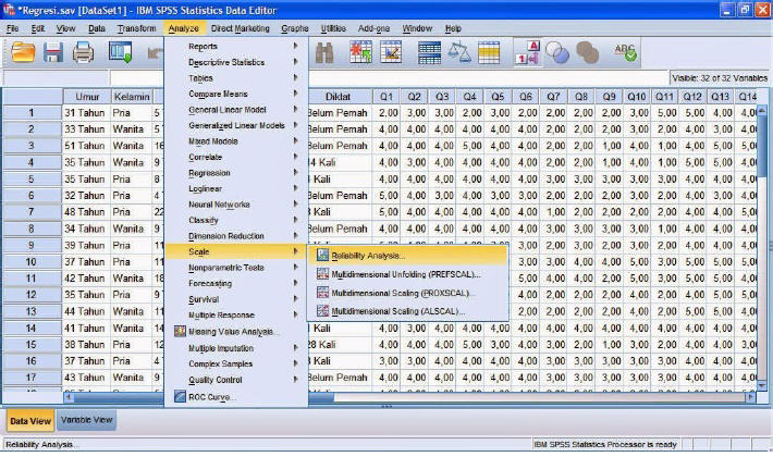 Tutorial SPSS – Apakah anda sedang mencari : Tutorial SPSS, cara menggunakan SPSS, cara olah data dengan SPSS, cara olah data kuesioner dengan SPSS, tutorial olah data kuesioner menggunakan SPSS, cara menggunakan spss, cara memasukkan data kuesioner ke spss, olah data SPSS, contoh analisis data spss, data spss, fungsi spss, olah data statistik, spss statistik, SPSS, download spss 22, atau sejenisnya ? Anda datang pada tempat yang tepat. Karena disini akan dibahas secara lengkap bagaimana cara Olah Data Kuesioner Dengan SPSS lengkap beserta tahapan dan penjelasannya. Tutorial SPSS berikut ini disertai dengan Langkah-langkah olah data kuesioner SPSS meliputi : setting variabel, input data, pemetaan responden, pemetaan jawaban responden, compute variabel, menguji kualitas data, uji regresi, melakukan regresi, uji asumsi klasik, yang disertai dengan penjelasan lengkap.