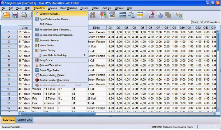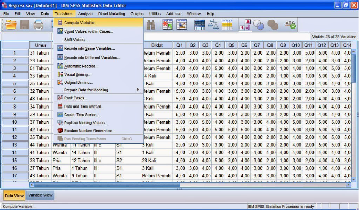 Selanjutnya setelah responden dan jawaban responden dipetakan maka sudah saatnya melakukan ujikualitas data, uji kualitas data dalam postingan ini menggunakan uji Validitas dan uji Reliabilitas. Untuk yang pertama kita lakukan uji Validitas. Sebelum melakukan uji Validitas terlebih dahulu konstruk-konstruk dari setiap Variabel dijumlahkan terlebih dahulu dengan cara Klik Menu Utama Transform lalu Compute Variable seperti Gambar Di bawah ini :