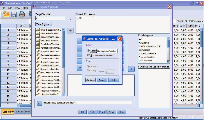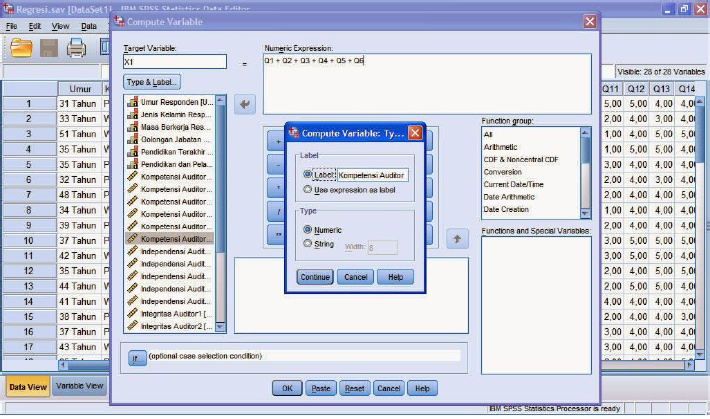 Dalam kotak dialog compute variable, pada target variable ketik X1 lalu klik Type&Label Ketik nama Variable yang dimaksud pada label (contoh disini : Kompetensi Auditor) lalu Continue. Kembali pada kotak dialog compute Variable, pada kotak numeric Xpression-nya jumlahkan Q1 + Q2 + ,,,, + Q6 untuk Variabel X1 dengan cara klik satu persatu konstruk tersebut kemudian klik tanda panah disamping lalu klik (+) Lalu klik OK.