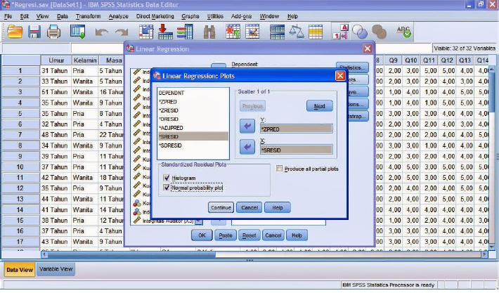 Kemudian Klik opsi Plot, maka akan muncul kotak linier regression : Plots. Pada kolom Y masukkan *Z-PRED dan pada kolom X masukkan *S-RESID lalu centang Histogram dan Normal Probability Plot pada kotak Standarized Residual Plots. Lalu Countinue Seperti gambar berikut :