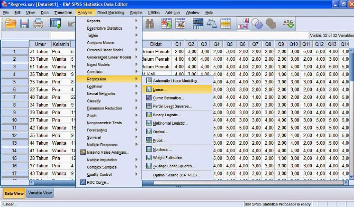 Setelah nilai rata-rata diperoleh untuk setiap Variabel, maka sudah dapat dilakukan regresi dengan cara Klik Analize pada menu utama lalu Regressions kemudian Linier, seperti berikut :