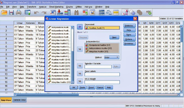 Maka akan muncul kotak dialog linier regressionnya. Pada kotak dialog tersebut, pada kotak dependent masukkan Variable dependent-nya (contoh disini : Kuaitas Audit) Lalu pada kotak independent masukkan) Variable-Variable independent-nya (contoh disini : Kompetensi Auditor, Integritas Auditor dan Independensi Auditor). Seperti berikut :